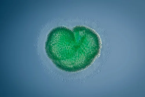 Differential interference contrast light micrograph of two genus of green algae. Pandorina sp. (right) and Eudorina sp. (left). They are microscopic green algae living in colonies and swim/rotate using flagella. The red dots are eye spots to allow them to swim towards the light. The colony is surrounded by a translucent mucilage. Magnification: x600 when printed at 10 centimetres wide at its longest edge.