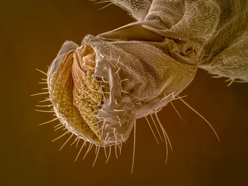 Fruit fly. Coloured scanning electron micrograph (SEM). This image focuses on the mouth parts of the species Drosophila melanogaster, a pivotal species in genetic and biological research. The photograph reveals the mouth parts structures. The structure includes specialised organs such as the labellum, maxillae, and proboscis, adapted for sponging up liquid nutrients. D. melanogaster's mouthparts are a subject of study for understanding feeding behavior, sensory reception, and ecological interactions. These features reflect the evolutionary adaptations that facilitate the fruit fly's diet of decaying fruit and microbial content. The detailed examination of such morphological features aids in the broader understanding of insect physiology and the genetic basis of anatomical diversity. Magnification: x170 when printed 10 centimetres wide.